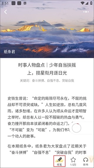 3、紧接着进入纸条详情页,点击底部“练笔”图标;