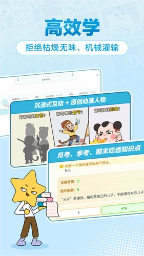 告别枯燥的学习体验,通过沉浸式互动与原创动漫角色的陪伴,让学习过程充满成就感;摒弃低效的题海战术,聚焦核心知识点进行针对性攻克,确保每一次练习都能带来实质性提升;摆脱机械的死记硬背模式,依托精选优质习题开展精准训练,以练代讲,将被动接受知识的“听”转化为主动探索的“学”。