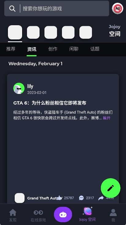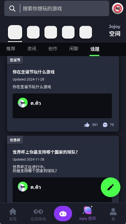 Jojoy是一款内容丰富的游戏盒子应用,它为我们提供了海量的游戏资源,甚至连游戏攻略和MOD资源都能找到!而且游戏类型十分多样,从热门新游到经典旧作一应俱全,几乎没有找不到的游戏。我们还能第一时间掌握各款游戏的最新动态和技巧,抢占先机提升实力!作为一款风靡全球的游戏库软件,社区功能自然不可或缺,在这里我们可以和其他玩家互动交流,发现更多优质游戏!