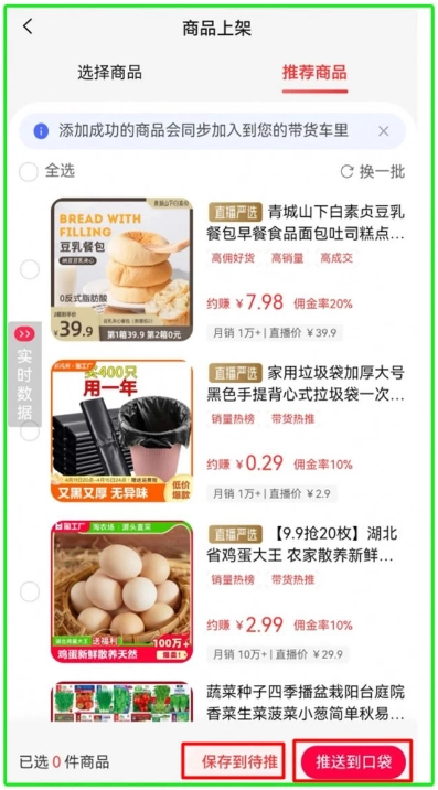 2. 按照需求选好要上架的商品后,可选择【保存至待推】或【推送至口袋】