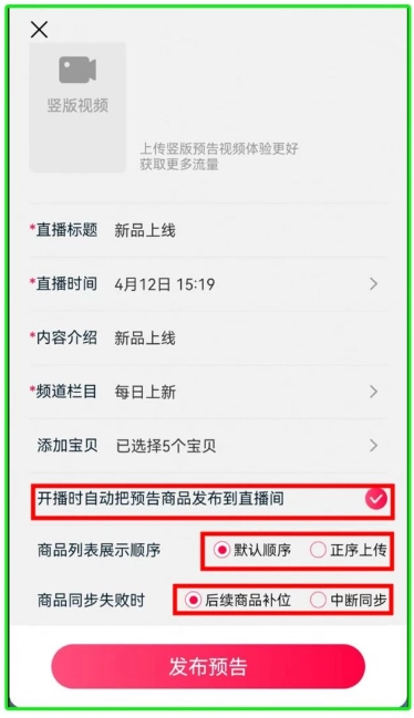 勾选【开播时自动把预告商品发布到直播间】后,可选择【商品列表展示顺序】和设置【商品同步失败时】的处理方式。请注意:若未勾选该选项,开播后需手动将商品推送至宝贝口袋。