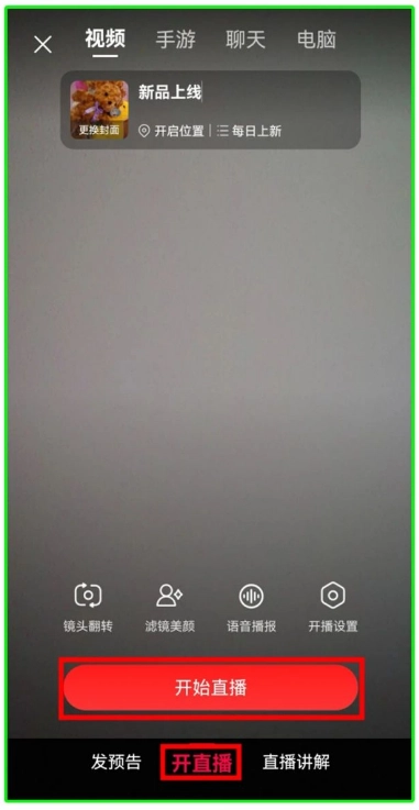 到达预告的直播时间后,先进入快捷入口,接着在【开直播】里调整好直播画面,最后点击【开始直播】就可以了。