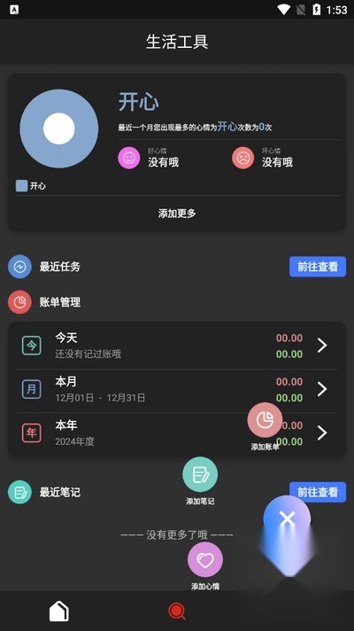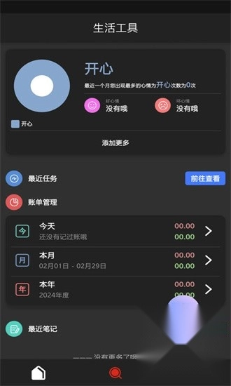生活工具涵盖添加心情、记录任务与账单,还有添加笔记等功能。