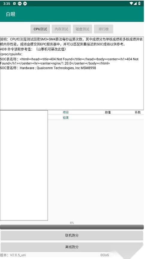 内存耗尽会引发程序崩溃,同时系统会定期校验已分配的内存,以此防范山寨设备的作弊行为;崩溃后重新启动程序,就能查看相关检测结果。