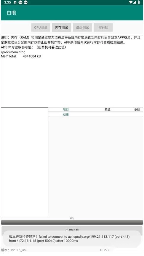 内存测试:采用暴力填充系统运行内存的手段,以此来辨别实际的运行内存。