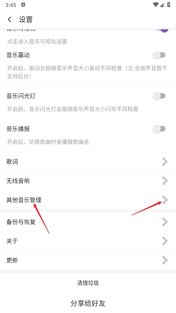 3、如图所示,在设置页面滑动至底部,点击“其他音乐管理”进入。