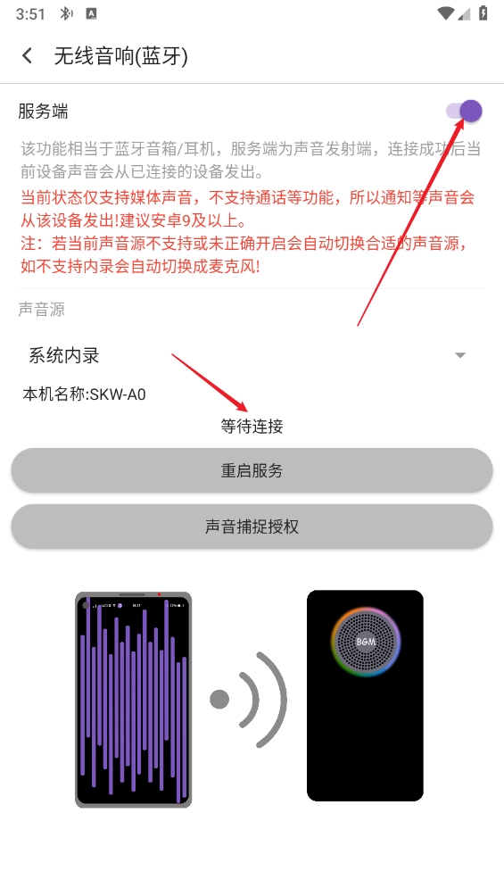 a、当前状态仅支持媒体声音播放,暂不支持通话等功能,因此通知类声音将通过该设备输出!建议使用安卓9及以上版本。