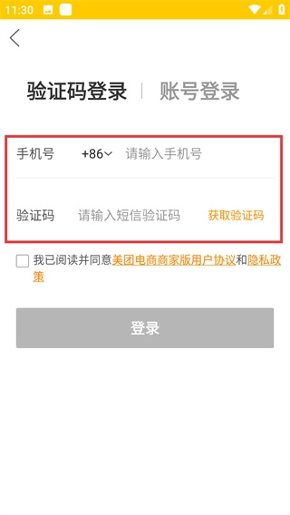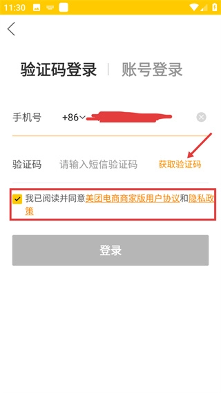 3、在验证码登录页面输入手机号后,勾选【美团电商商家版用户协议和隐私政策】,再点击【获取验证码】按钮。