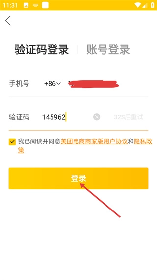 4、在验证码登录页面输入验证码后,点击黄色的【登录】按钮,即可完成美团电商商家版的账号登录操作。