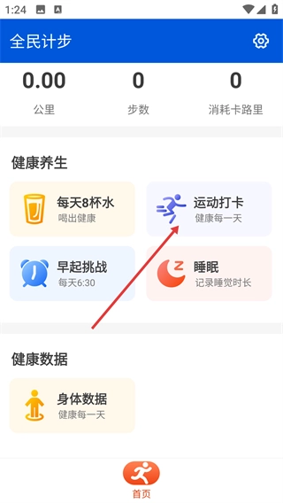 1、打开“全民计步”首页后,找到并点击【运动打卡】选项,即可进入运动项目的打卡选择页面。