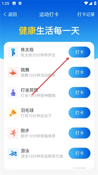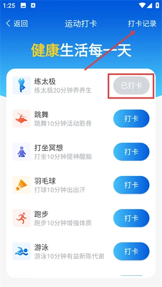 在运动打卡页面,挑选目标项目(例如练习太极),点击对应的【打卡】按钮,即可完成该项目的打卡。