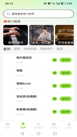 首页整合了多个不同主题的铃声资源,方便用户轻松浏览查看。