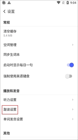 在【设置】界面的播放和发音区域找到跟读设置,我们点击它。