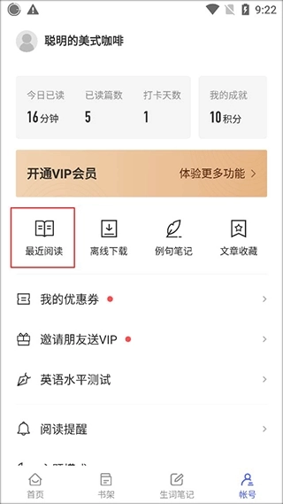 在账号界面找到最近阅读并点击。