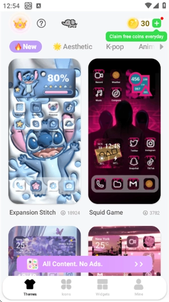1、在本站完成themepack主题的安装后,启动软件并进入界面,接着选择主题风格,这里有新品、霓虹、美学、粉色、动态资源等丰富多样的风格可供挑选;