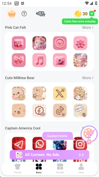 进入“Icons”板块后,你可以挑选Pink Cat Felt、Cute Milktea Bear等不同风格的图标包,要是想自己设计图标,还能点击“Custom Icons”进行自定义设置。