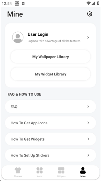 在“Mine”板块,你可以登录账号,查看自己的壁纸库和小部件库,也能找到FAQ以及使用教程,比如如何获取应用图标、小部件之类的内容。