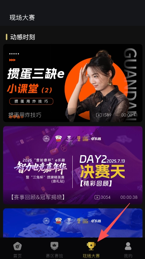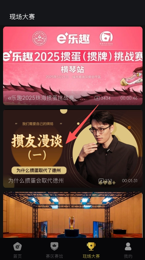 进入现场大赛板块,能观看掼蛋小课堂、赛事回顾、掼友漫谈之类的视频。