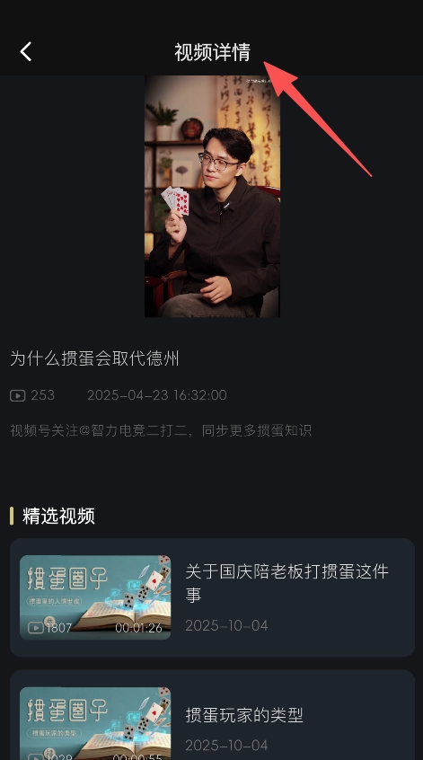 2、具备视频详情查看能力,点击视频即可浏览发布时间、简介以及精选视频推荐,助力用户进一步熟悉内容并挖掘更多关联的掼蛋视频。