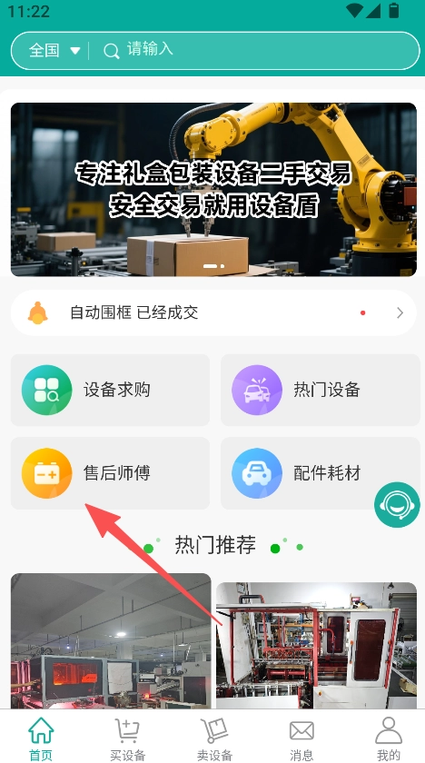1、围绕礼盒包装设备的二手交易场景,搭建设备求购、热门设备、售后师傅、配件耗材等功能板块,实现设备交易全流程服务的覆盖。