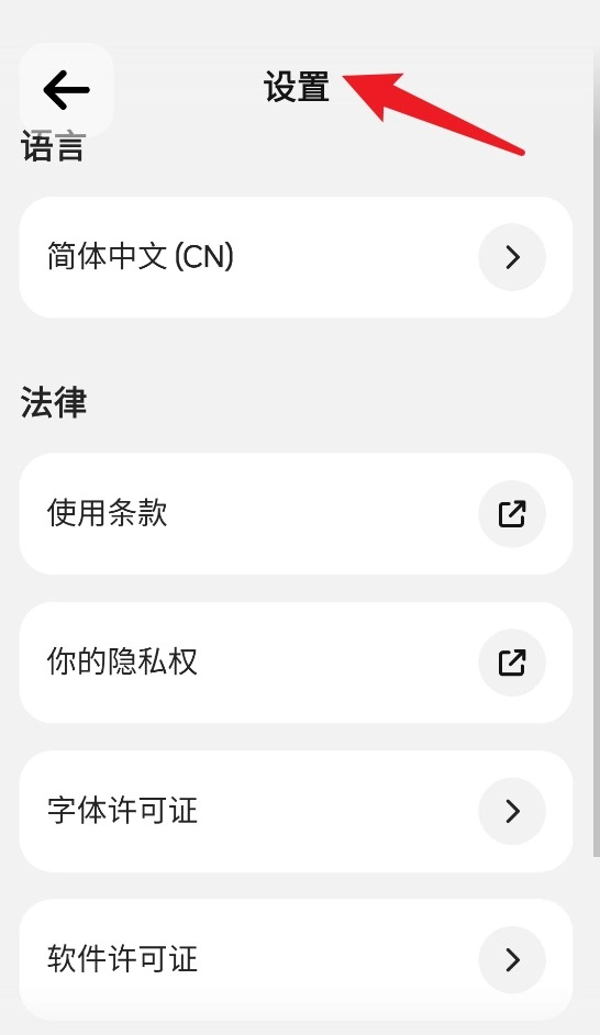 5、点击右上角的齿轮图标进入设置界面,在这里可以进行显示语言的切换,还能查看使用条款、隐私权政策等与法律相关的信息。