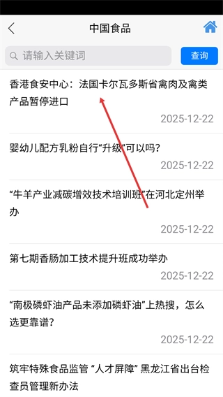 3、在【中国食品】资讯列表中,点击目标资讯标题(如相关进口通知类内容),即可进入该资讯的详细阅读页面。