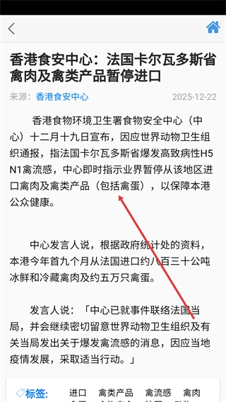 4、进入资讯详情页后,可阅读完整内容,了解如香港食安中心发布的法国禽类产品暂停进口等食品相关的政策与动态。