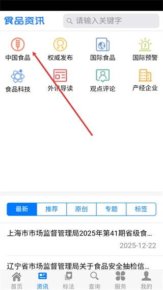 2、进入【食品资讯】页面后,点击【中国食品】分类选项,即可查看该分类下的食品相关资讯列表,获取对应领域的信息。