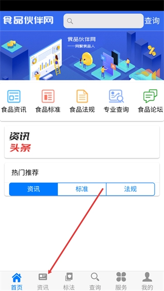 1、在【食品伙伴网】首页,点击底部导航栏的【资讯】按钮,可进入食品资讯板块,查看各类食品相关的信息内容。