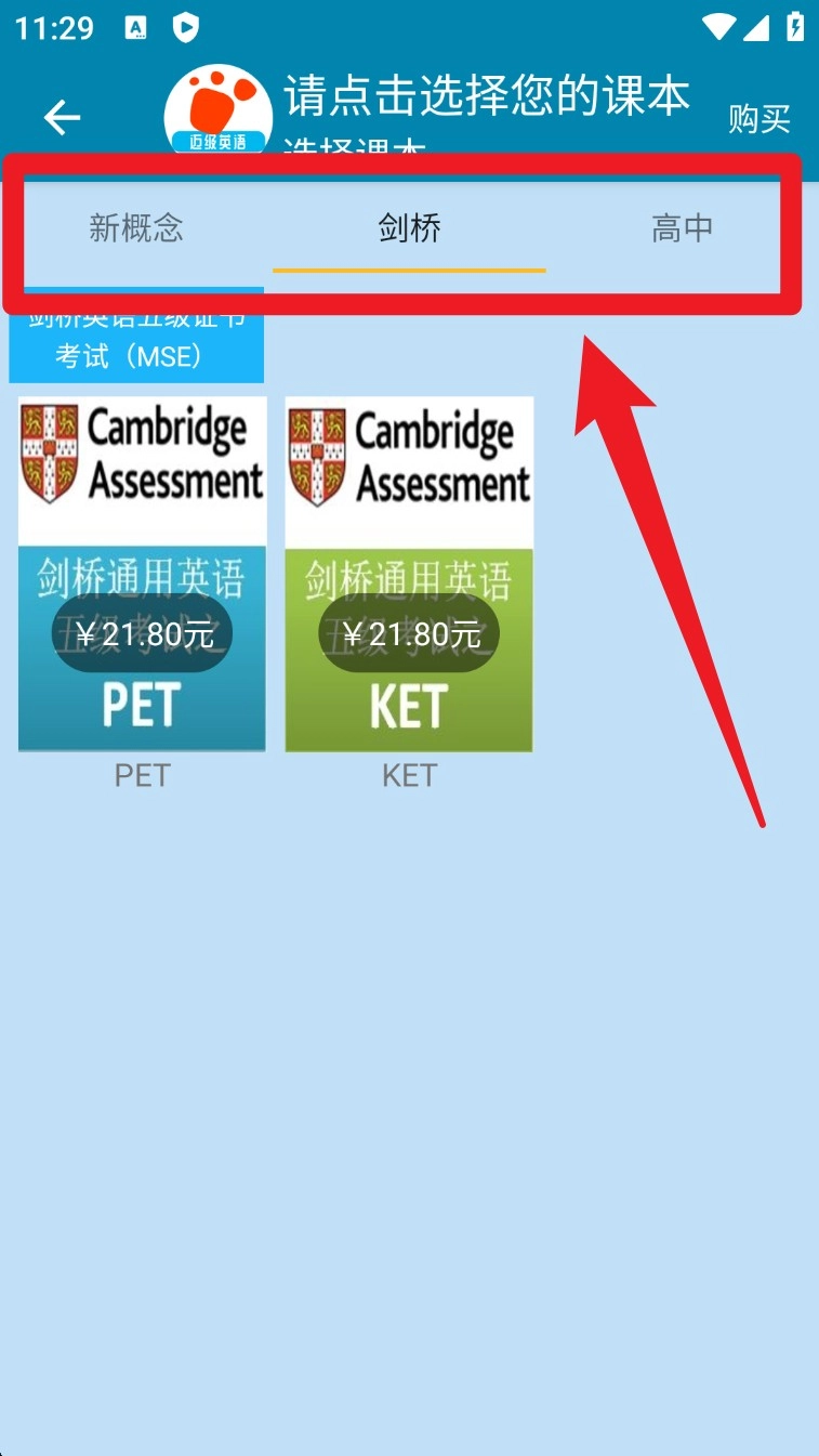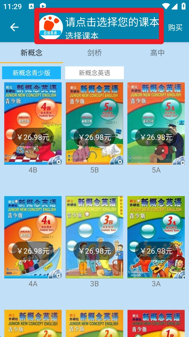 1. 进入课本选择页面后,可从新概念、剑桥、高中等分类中挑选所需教材版本。