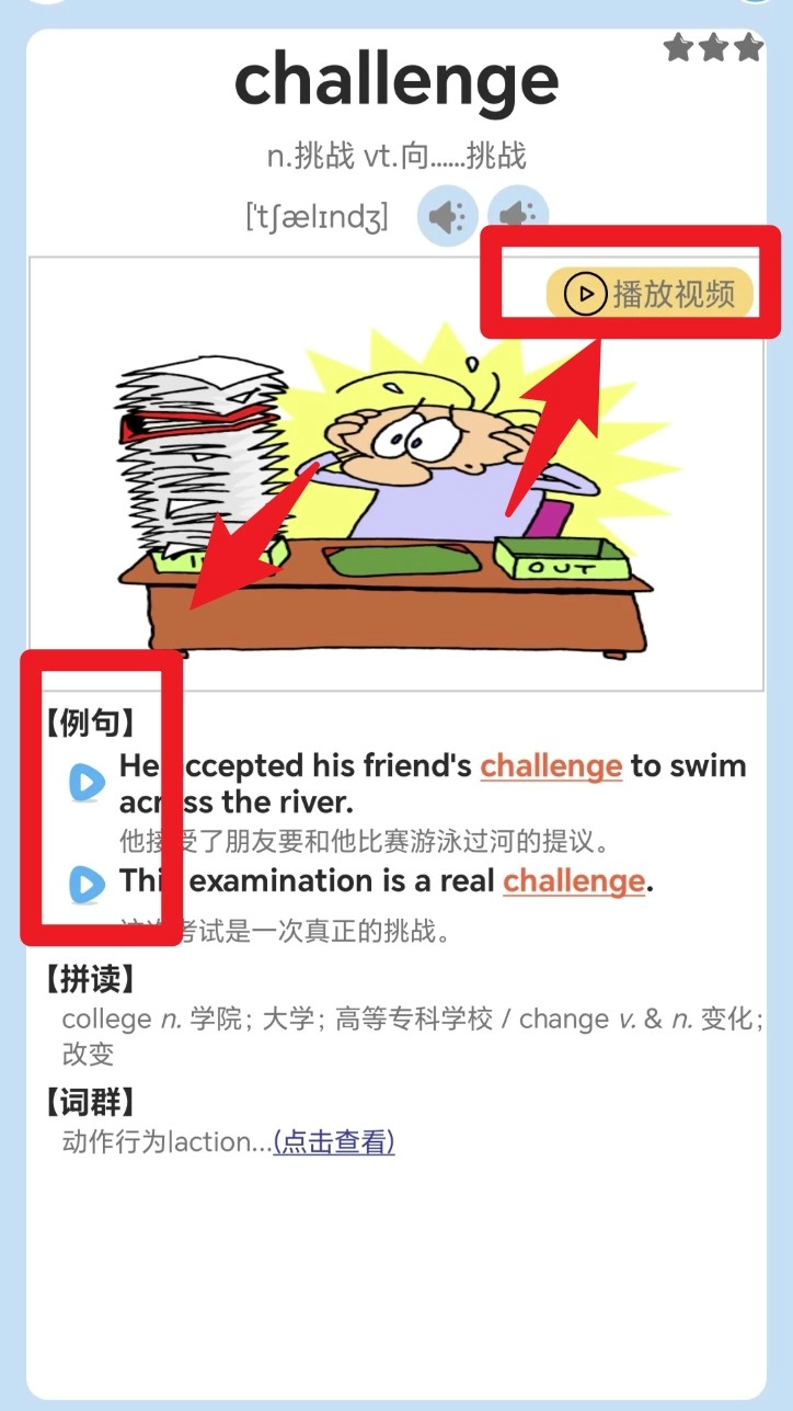 3. 在单词学习页面,你能够查看单词的词义、例句和插图,还可以点击播放相关视频或者例句的朗读音频。