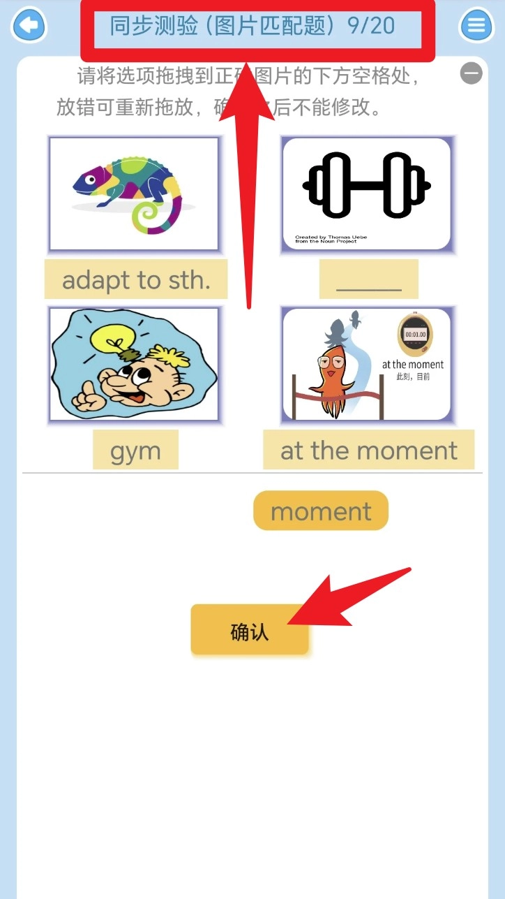 4. 进入同步测验后,将单词拖入对应图片下方空格,完成匹配后点击确认提交。
