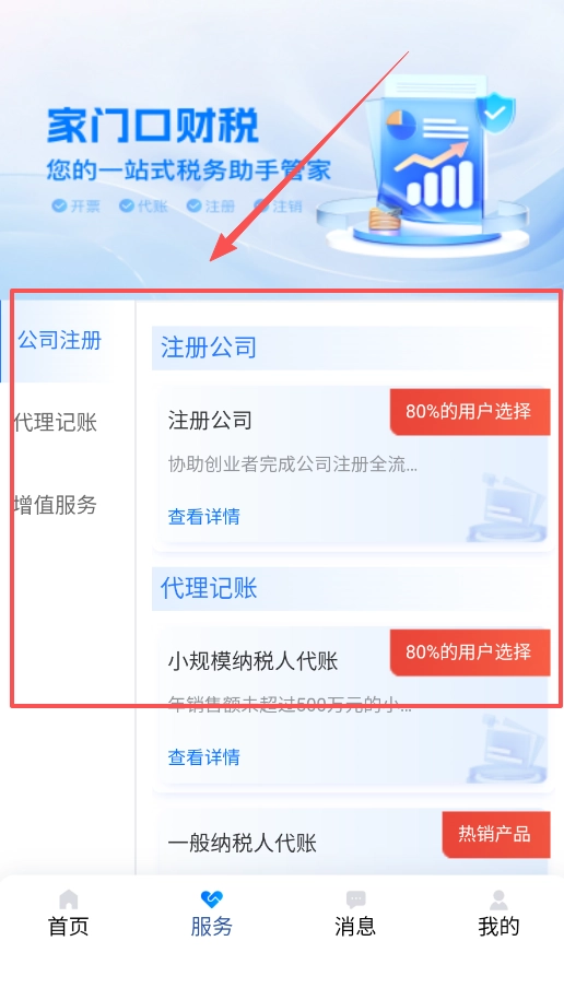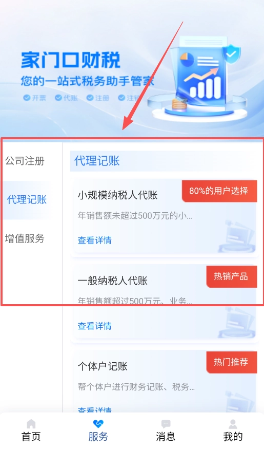 3、服务选择功能整合了公司注册、代理记账、变更注销等多种服务套餐,用户能够查看各套餐详情并自主进行对比,之后下单即可享受专属服务。