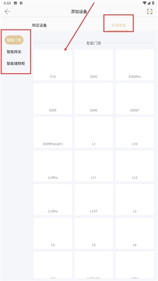 2、在添加设备页面,选择设备类型(如【智能门锁】),可通过【手动添加】选项,自主录入设备信息。