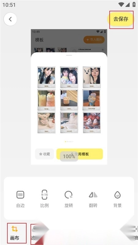 4、进入编辑界面后,能够调整画布大小、添加滤镜效果、一键插入文字内容,还可以使用画笔或马赛克等工具进行创作;编辑工作完成后,点击“去保存”按钮就能将图片导出。