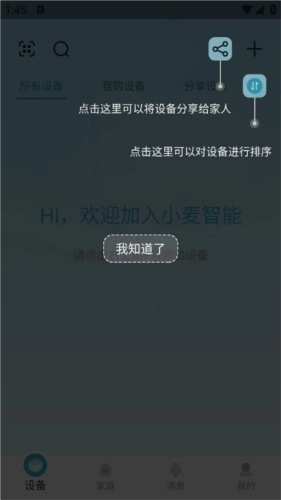 3、点击图中的分享图标,可将设备分享给家人;点击下方的排序按钮,能对设备位置进行调换。
