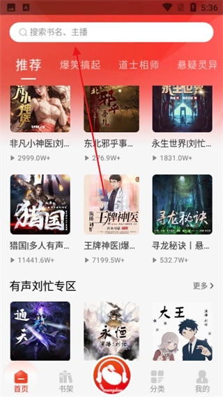 2、接着点击进入首页,就能直接搜索你喜欢的书籍或者主播了。