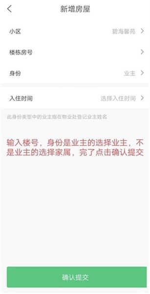 2、请准确填写楼号与房间号,并根据身份进行选择:若为业主则选“业主”,若非业主则选“家属”。填写无误后点击提交即可;业主提交的信息,物业会核实通过。