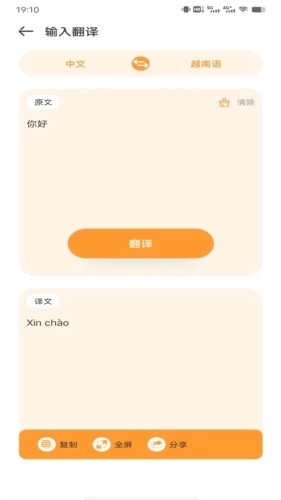 [文本翻译]提供中文与越南语的互译服务,呈现原文和译文的双语对照形式;具备复制、收藏、分享、全屏预览等功能,翻译结果既快速又准确!