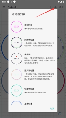 1、添加计时器时,只需点击“+”号按钮,接着在弹出的计时器列表里挑选想要添加的计时器就行。