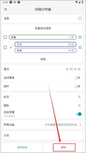 方式二:长按进入计时器设置界面,滑动到最底部,选择删除选项即可完成操作。