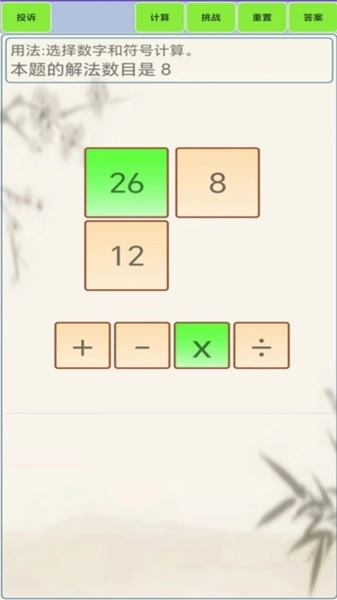 用加法、减法、乘法、除法这四种运算方式,将4个正整数计算得到24,每个数字都得用上,而且只能用一次。题目难度不一,要是解不出来,可以点击提示查看解题思路;要是计算出错了,可以返回上一步,或者重置这道题。这里面有三种模式,分别是简单练习、经典练习和竞速练习。简单练习只有加减法,难度较低。自由练习模式有大量题目,能随意游玩。竞速练习模式限时3分钟,看看你的口算速度能完成多少道题。
