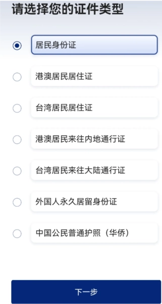 2、接下来会弹出服务协议和隐私规则,在同意相关条款后,选择你需要进行认证的证件类型,可选的证件类型包括居民身份证、港澳居民身份证、台湾居民身份证等,选好后点击下一步即可。