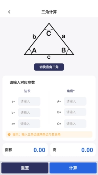 展示三角计算的计算界面,只需要输入参数就能计算出来结果了。