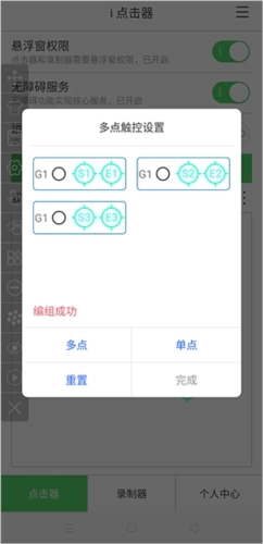 3、点击多点触控设置按钮,选中之前添加的三个滑动手势,点击多点完成编组操作,编组成功后点击完成,关闭多点设置弹窗。