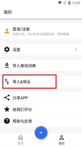 2、点击“我的”,再选择“导入离线词典”选项,系统便会自动完成导入操作。