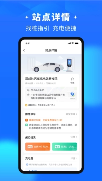 通过目的地电站搜索、已收藏的电站列表以及附近充电站点的查找功能,能快速定位到目标充电站;进入电站详情页面后,还可实时了解各充电终端的使用状态。