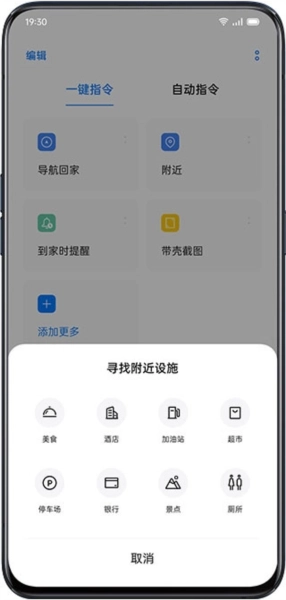 想快速了解周边有什么设施吗?只需点击「附近」进行相关设置,等默认应用配置完成后,再次点击「附近」,就能查找美食、酒店、加油站、超市等各类场所,系统会自动为你打开地图应用。