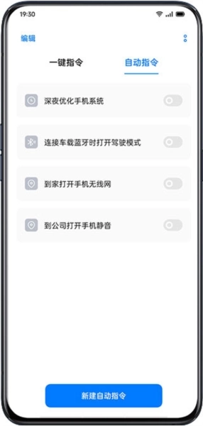 系统已预先设置了若干常用指令,包括:深夜对手机系统进行优化;连接车载蓝牙时自动开启驾驶模式;回到家中时打开手机无线网络;抵达公司后开启手机静音模式。
