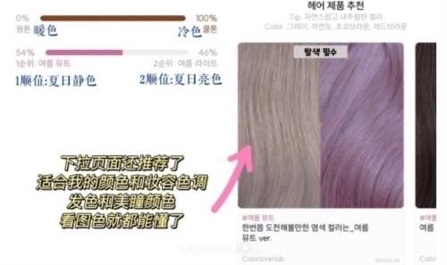 8.最后就可以得到个人色彩诊断结果,下拉页面还推荐了适合的颜色和妆容色调发色和美瞳颜色;